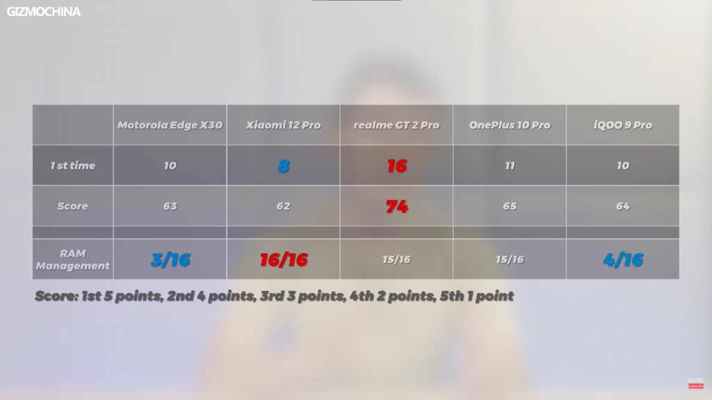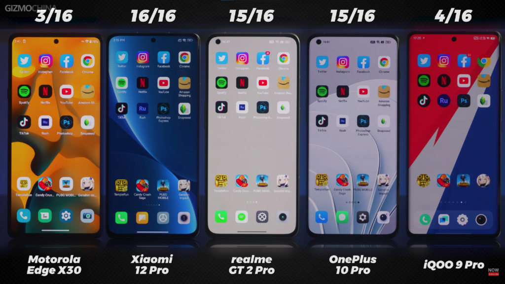 To answer this question, the Gizmochina team has pitted the Xiaomi 12 Pro, the OnePlus 10 Pro, the Realme GT 2 Pro, the iQOO 9 Pro, and the Moto Edge X30 against one another to see which device offers lower app opening and loading times as well as how well the devices manage their RAM.
