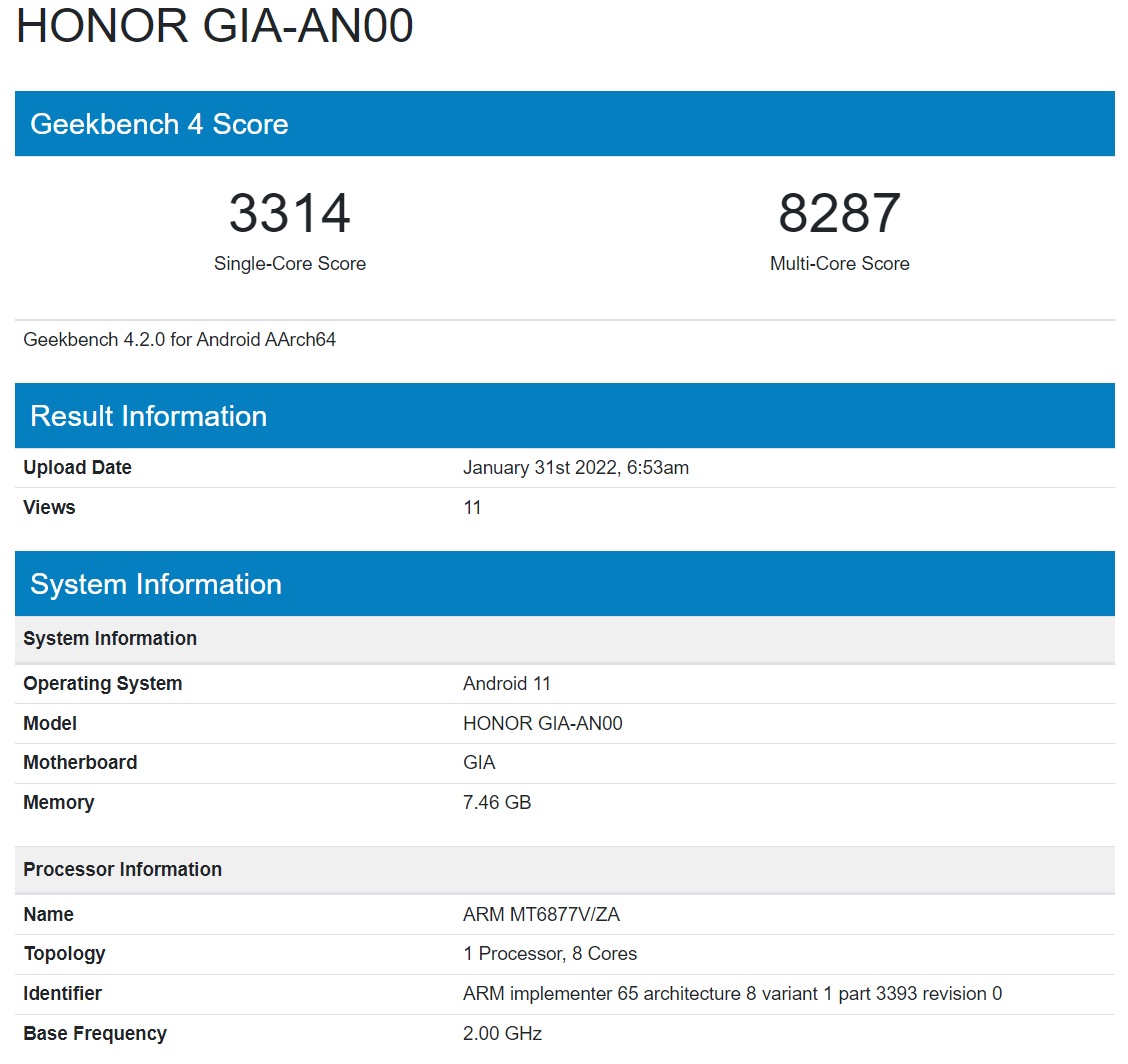 One important aspect that the GeekBench listing reveals is that the Honor 60 SE will be powered by a MediaTek Dimensity 900 processor with one of the memory configurations having 8GB of RAM. The Dimensity 900 SoC was first announced in May 2021 and it features an Octa-core architecture made up of two ARM Cortex A78 processors with a clock speed of up to 2.4GHz and six ARM Cortex A55 cores that can reach up to 2GHz.
