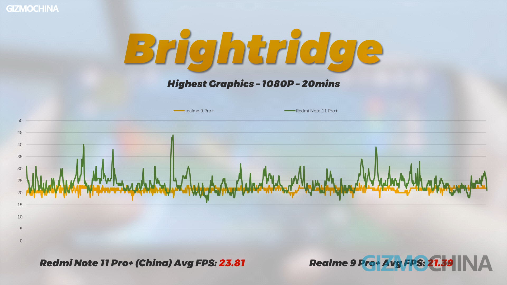 Brightridge is locked at 22fps on the realme 9 Pro Plus, and the phone’s temperature is only 36 degrees Celsius. So we can’t see the real gaming performance of realme 9 Pro Plus either.