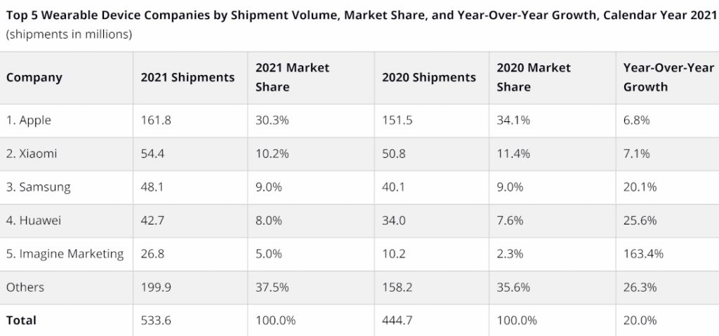 Samsung is the third-largest wearables vendor in 2021, thanks to the Galaxy Watch 4 series. The Korean tech giant saw a 20.1% YoY growth last year with an estimated 48.1 million units in shipments.