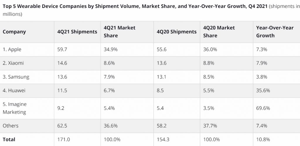 The biggest improvement was recorded by the Indian company Imagine Marketing, which owns the BoAt brand. The brand came in 5th place in the global market propelled by its exploit in the Indian market. This indeed underscores the rapid growth of the Indian wearable market. boAt recorded an estimated shipment of 28.6 million units as against 10 million units shipped last year. This represents a staggering 163.4% YoY growth. In Q4 2021, the company’s shipments grew 69.6% YoY.
