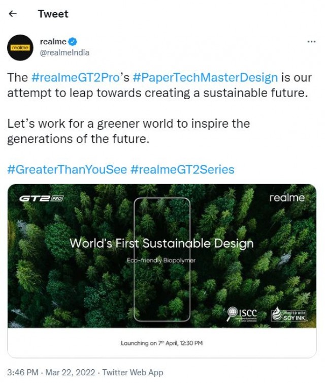 As a reminder, the Realme GT2 series packs an “innovative bio-based design” for the rear panel and that is the main teaser on the poster. The GT2 Pro packs a 6.7-inch AMOLED LTPO 2.0 display with a Quad HD+ resolution and support for a 120Hz refresh rate. The models are powered by Qualcomm’s latest Snapdragon 8 Gen 1 chipset is present under which is paired with LPPDR5 RAM and UFS 3.1 storage. There is a 5,000mAh battery under the hood of the GT2 Pro that supports 65W fast charging.
