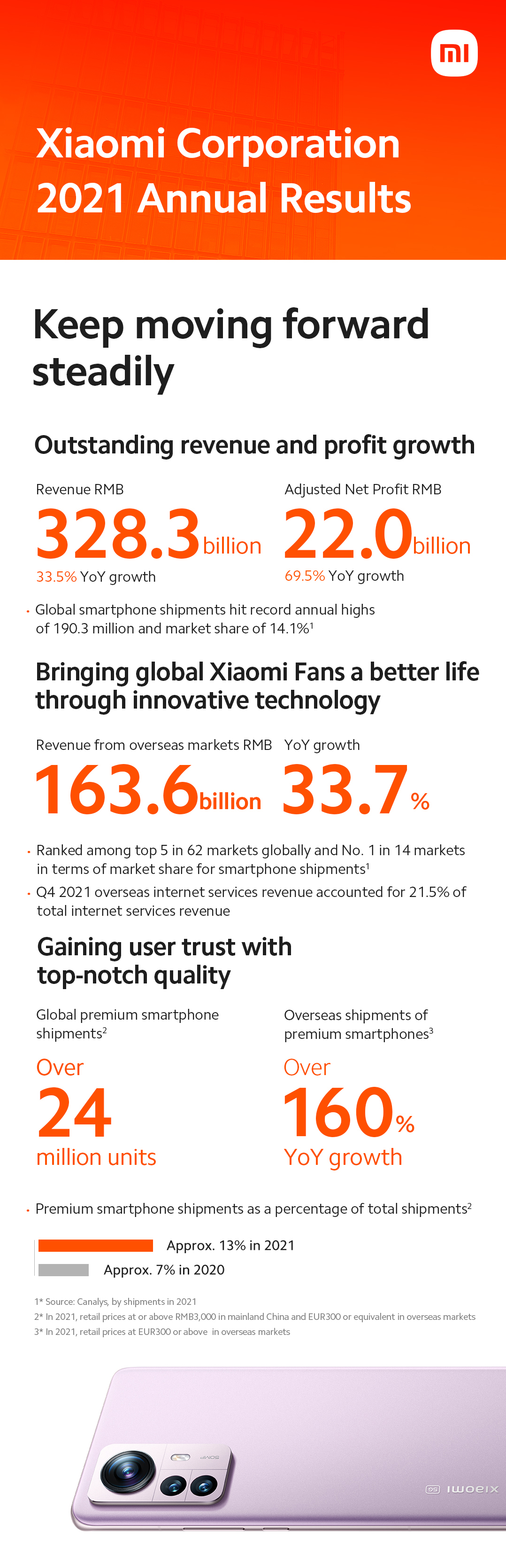 As per the financial results, Xiaomi recorded a 33.5% growth in total revenue for the year 2021 while the adjusted net profits rose by 69.5% from 2020. The corresponding figures were 328.3 billion yuan ($51.6 billion) in total revenue and 22 billion yuan ($3.45 billion) in adjusted net profit for 2021.