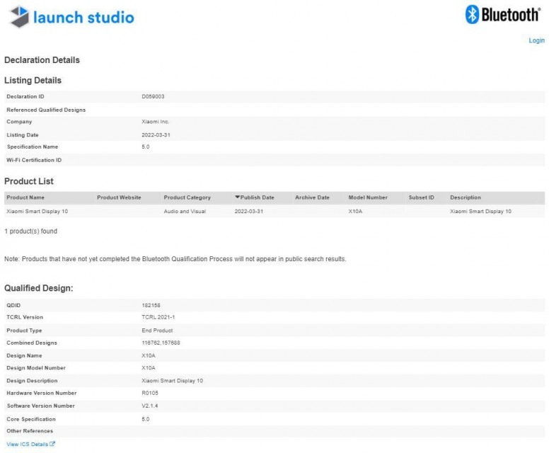The certification confirms the Bluetooth version and possible display size of the product. The model number is X10A and it also has the stated name Xiaomi Smart Display 10. It is likely that the new display will be 10 inches in size. That will mean that the new smart display is larger than all of Xiaomi’s or Redmi’s current smart displays. As per the Bluetooth version, the Xiaomi Smart Display 10 will be compatible with Bluetooth version 5.0. The hardware version and software version for the device as listed in the Bluetooth SIG database are R0105 and V2.1.4, respectively.