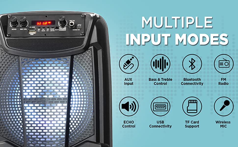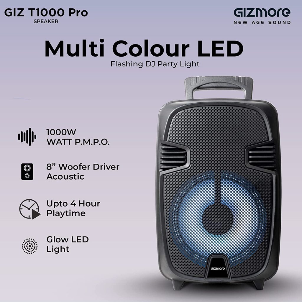 The Gizmore Wheelz T1501N offers a sound output of 2000W and also has an 8-inch subwoofer and 20W strong party speaker. A wired microphone, digital RGB lighting, and multiple input options are available with the trolley speaker. It also has a 3,600 mAh battery that translates to 4 hours of playback. FM radio, a wireless microphone, and a portable remote are also part of the package.