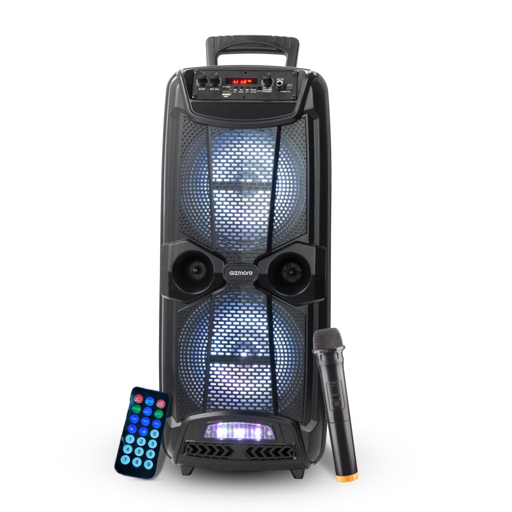 The Gizmore Wheelz T1000 Pro and T1501N trolley speakers can operate either wirelessly or via a wired connection. When they function wirelessly, they offer a battery life of 4 hours. The Gizmore Wheelz T1000 Pro has a 1000W capacity and an 8-inch subwoofer. It comes with a wired microphone and digital LED lighting. Other features are SD/TF card, USB, AUX, and a 2,200 mAh rechargeable battery. It also has a wireless microphone and remote control for enhanced functionality indoors or outdoors.