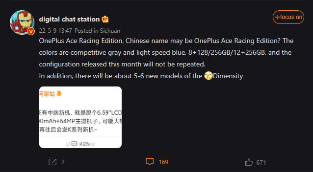 The Weibo tipster has also stated that the OnePlus Ace Racing edition will be available in 8GB + 128GB/256GB and 12GB + 256GB configurations. It will be a limited edition release and is likely to debut this month only. Additionally, the tipster also informs that the company is planning around 5 to 6 new smartphone models with a Dimesity chipset inside.