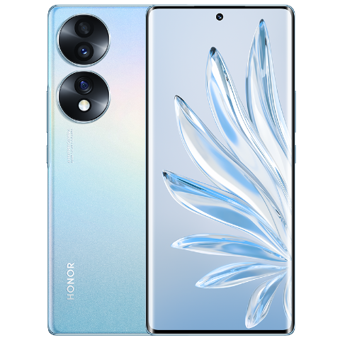 The Honor 70 is listed in four colors: Bright Black, Streamer Crystal (white), Mo Yuqing (green), and Iceland Fantasy (blue). The handset can be seen sporting a punch-hole display with curved edges. Its back panel has two camera rings. The first one houses a pair of cameras, while the second camera ring includes the third camera and an LED flash.
