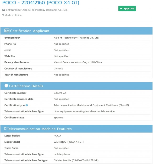 The Poco X4 GT seems to be close to its official unveiling as the device has gotten the NBTC certification in Thailand. The rumored Poco X4 GT with model number 22041216G is listed on the Thai certifying authority’s website. Few details were provided for the model.