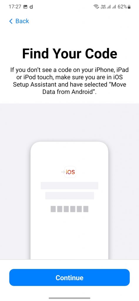 - Press “Continue” once the export is ready, and the data will move to your iOS device from your Android phone.