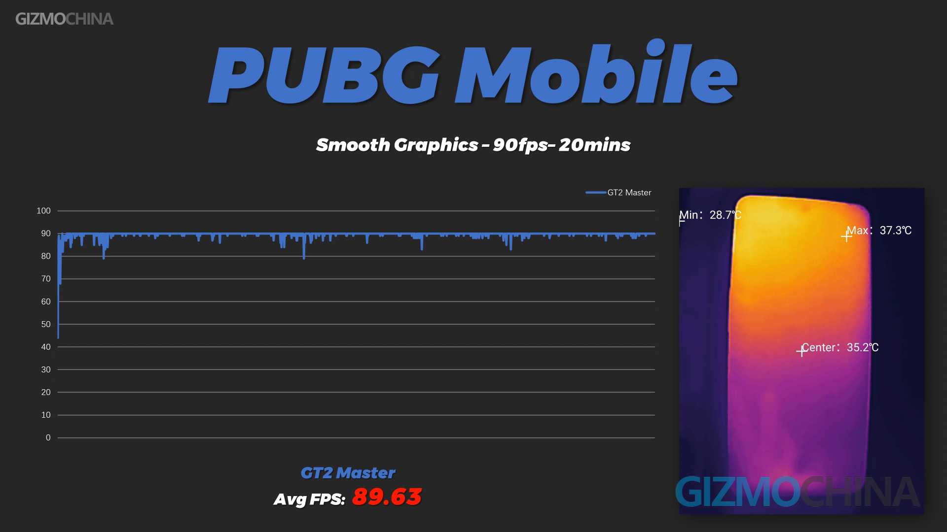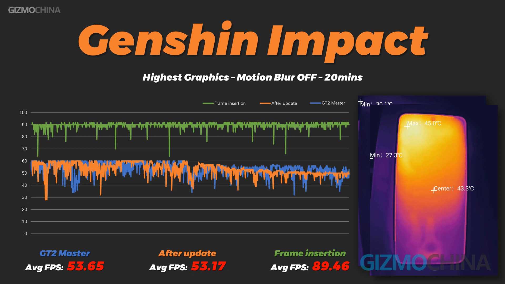 OK, let’s look at the actual game performance. The GT2 Master can run at 90fps on PUBG and the phone barely gets hot. There is no need to turn on the game frame insertion, plus with the trigger, it’s certainly a great PUBG machine. The frame rate curve on Genshin is a bit more interesting. In the early versions of the system, you could see the GT2 Master locked at 55fps in the second half of the game, and the frame rate fluctuated quite a lot. However, after an update, the maximum frame rate was further limited for a more stable gaming experience. However, the average fps and phone temperature did not change much. With the game frame insertion turned on, Genshin was able to reach 90fps and was very stable. Although Realme says that the game frame insertion will increase power consumption, however, we did not find such impact in this mode, and the temperature is almost unchanged. So that’s why I recommend you turn on this feature in Genshin Impact.