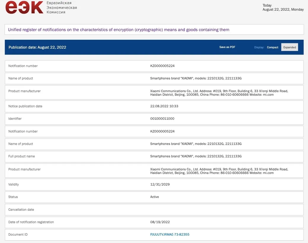 A report from MySmartPrice reveals that new Xiaomi devices have been spotted on the EEC certification site with 2210132G and 2210133G model numbers. These devices are believed to belong to the upcoming Xiaomi 13 series.
