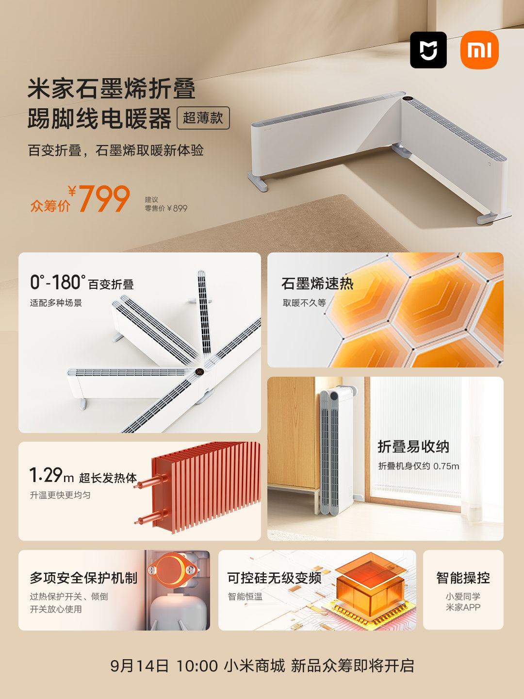 Xiaomi has launched the MIJIA Graphene Folding Skirting Board Electric Heater Ultra-Thin Model in China. The new electric heater is available for pre-order from September 14. The heater is rated at 2.22kW and can raise the room’s temperature by 5ºC in ten minutes. It can be folded in half making it compact for easy storage. The heater is 6cm thick and 1.5m long when unfolded. The heater’s panel can be folded at 90 degrees as well.
