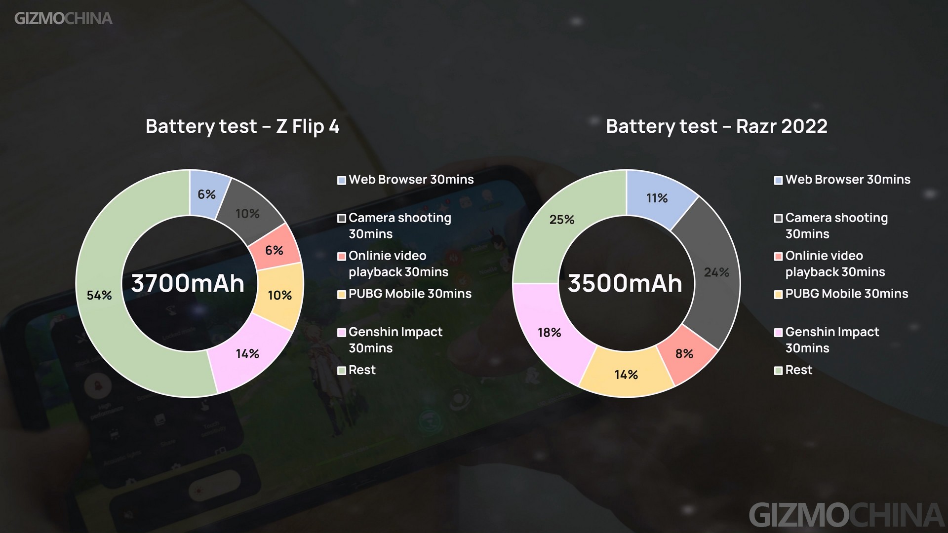Both phones bring improvements in battery life. The new Razr is equipped with a 3500mAh battery, while the new Z Flip was upgraded to a 3700mAh capacity. But they still don’t compare to almost all the regular phones. The Razr 2022 supports a slightly faster-charging speed, but it still took us around 63 mins in the charging test. Oddly enough, the new Razr model consumed much more power in our latest battery-life test, while the new Flip’s result is much more acceptable.