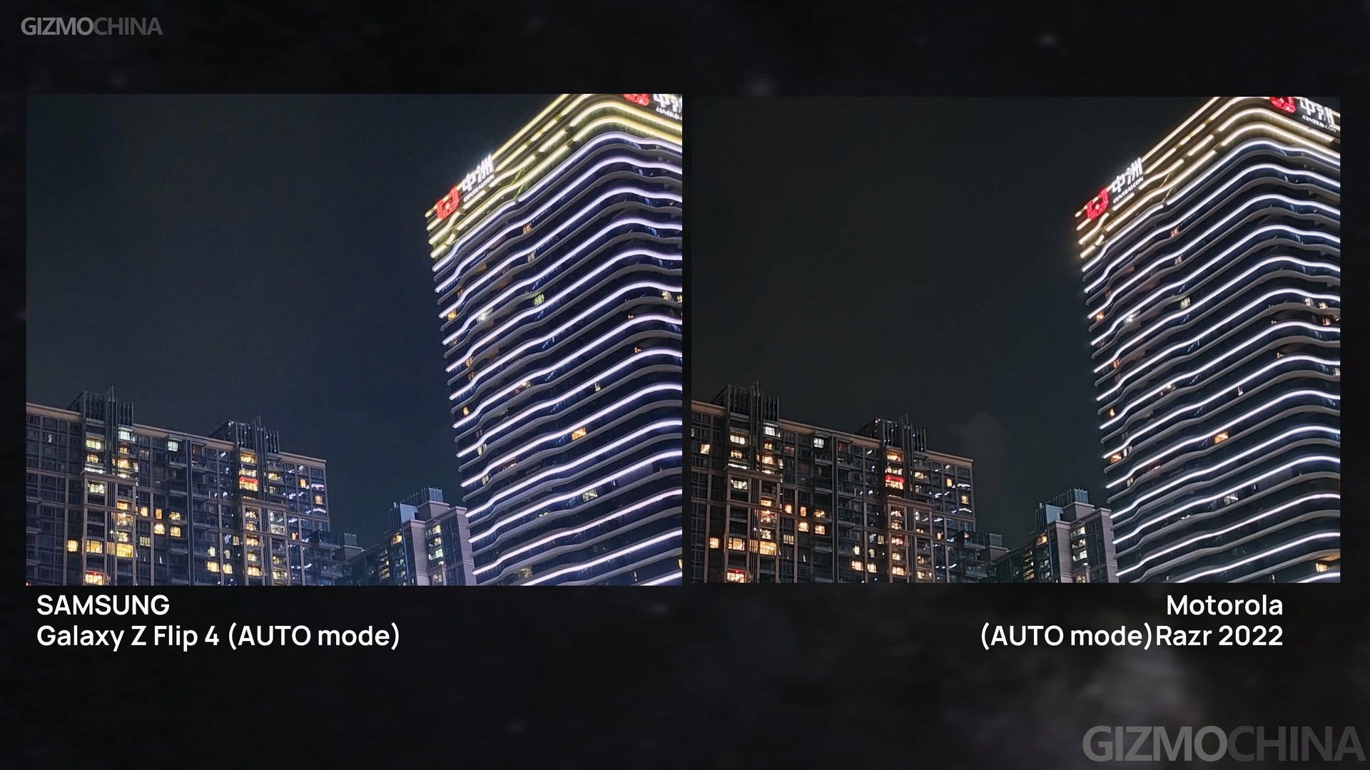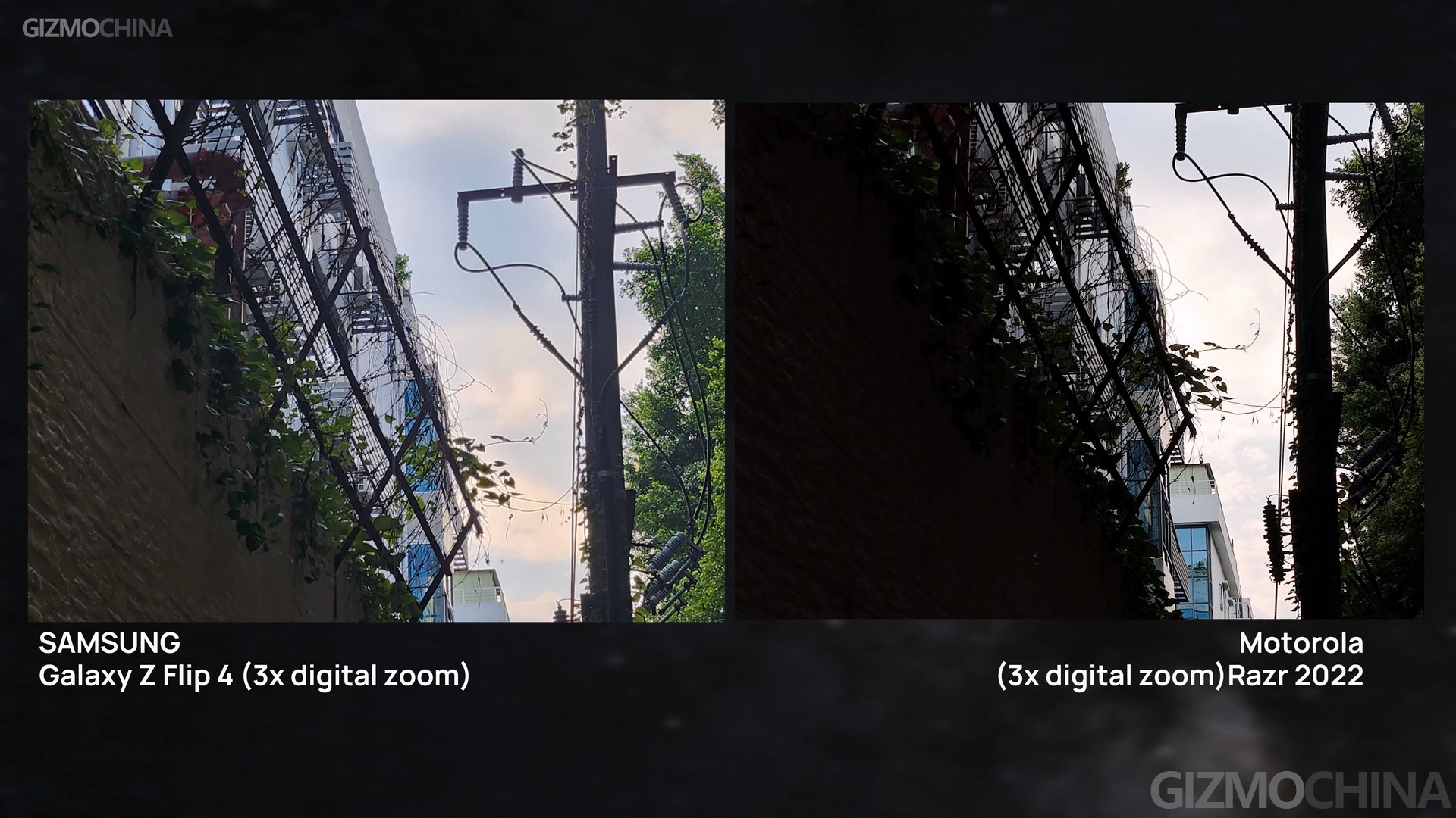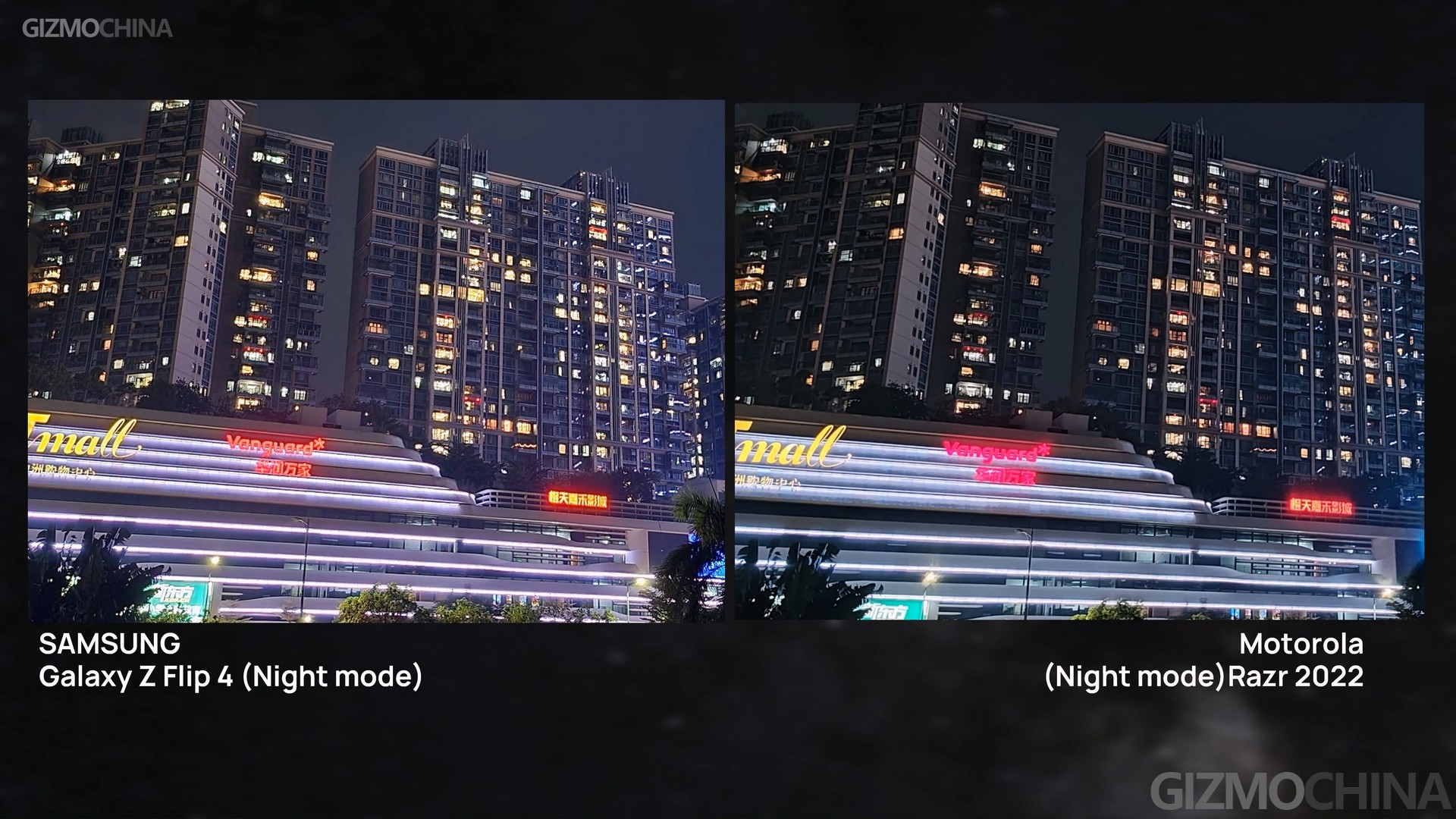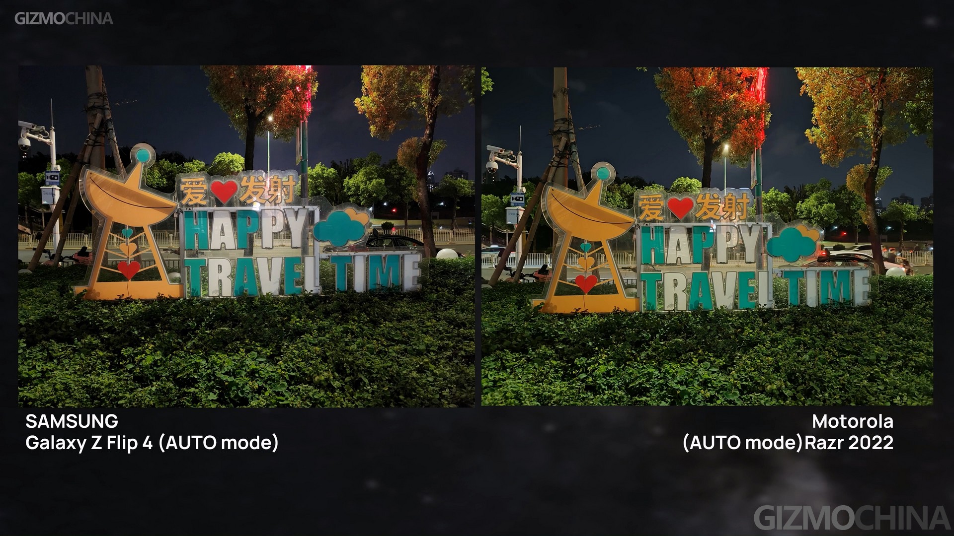 Well for night shooting, things changed. The larger sensor of the new Razr finally came into play. The images shot on the Razr have and more accurate colors and better noise control for darkness. And even under the auto mode, the bright detail also got well-processed with correct exposure. Although we could have a better image under the Flip’s night mode with less noise, the Razr’s sample still looks better.