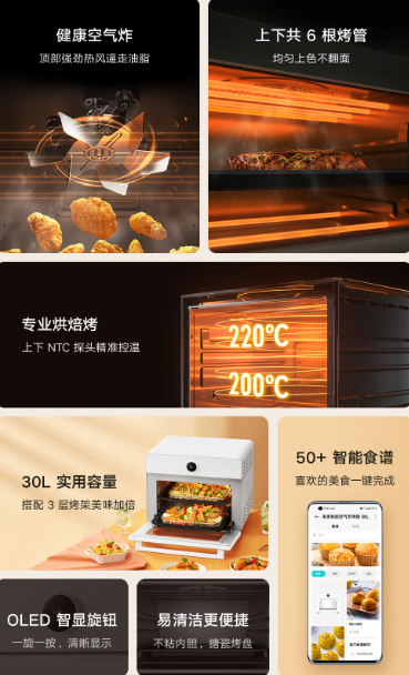 The MIJIA smart air fryer is a great addition to the kitchen and will deliver healthy foods to the family at short notice. The oven has independent temperature controls for the upper and lower baking pipes, thanks to two NTC probes. This means that the temperature (upper or lower) can be adjusted to suit your cooking needs and prevent burning/ undercooking. The air fryer also has other features that enable easy cooking like fermentation, thawing, heat preservation, etc.