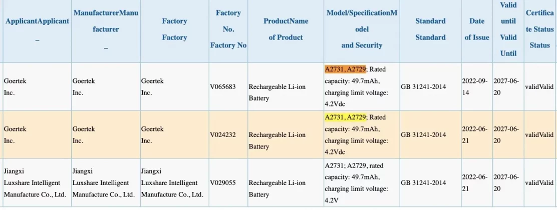 According to the 3C listing, each earbud of the AirPods Pro has a 49.7mAh battery. A2731 and A2729 are the model numbers for the TWS battery.