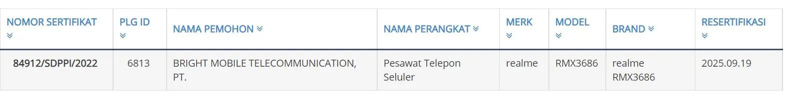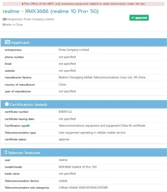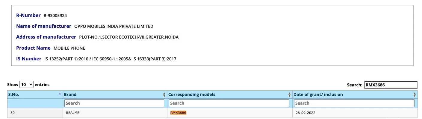 Starting off, the device has emerged on the NBTC database. The listing reveals that the device has RMX3686 model number and confirms the Realme 10 Pro+ moniker. The same model number has also appeared on BIS along with TKDN, NBTC, EEC, and Indonesia Telecom certification databases.