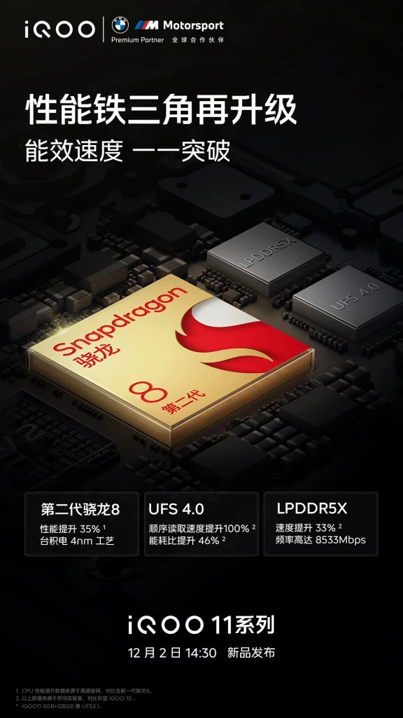 Now, just days before the official launch event, the company has shared a new teaser poster that reveals some information about the iQOO 11 series’ processor and memory.