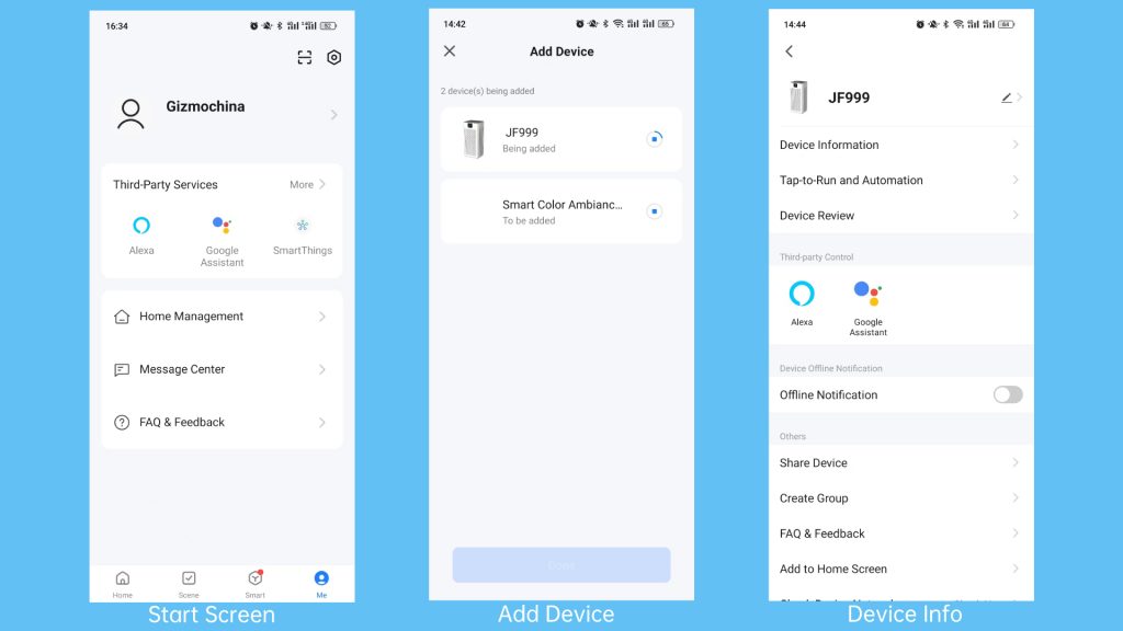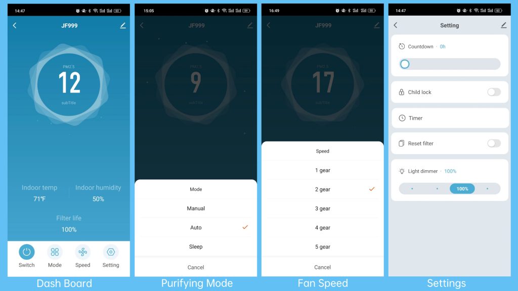 Thanks to the smart auto mode, after the JF999 starts working, you basically don’t need to care about how it works anymore, it can automatically adjust the working mode through the built-in air quality sensor, there are five fan speeds, usually the JF999 will work between 1 gear and 2 gear, and you can hardly hear the fan. You can also switch to sleep mode or create your own air cleaning schedule via the Smart Life APP according to your needs.
