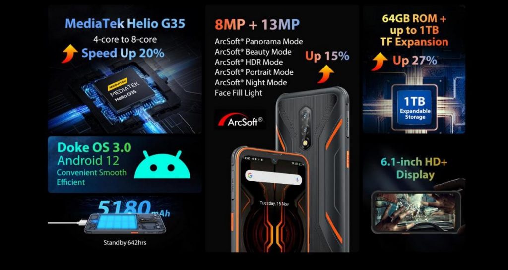 Blackview BV5200 Pro features a 6.1-inch HD+ display and comes with 4GB RAM expandable up to 7GB and 64GB ROM expandable up to 1TB. Unlike its predecessor which used a quad-core processor, the BV5200 Pro uses an advanced MediaTek Helio G35 octa-core processor and runs the latest DOKE OS 3.0 based on Android 12. Unlike the bulky and heavy rugged phones available in the market, the BV5200 Pro weighs just 268g and comes with a 13.65mm sleek and slim body