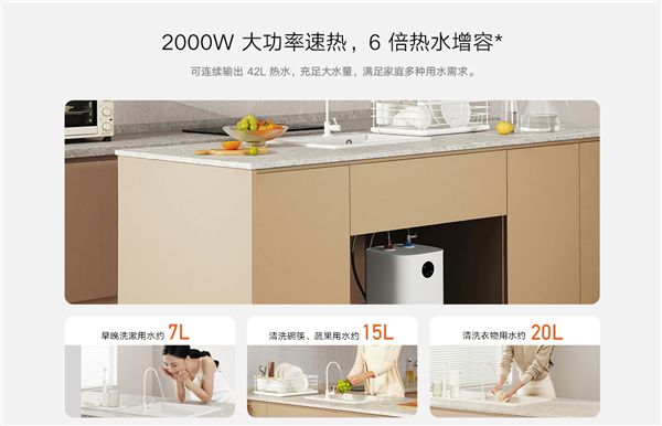 Also called the Water Storage Electric Water Heater, the MIJIA Kitchen Treasure offers up to 6 times more improvement in capacity than its predecessor. The MIJIA Smart Kitchen 7L S1 will deliver all the hot water needs of the family at any time. It has a built-in seamless liner that prevents water leakage, as well as a dense polyurethane insulation layer. It provides 24-hour heat preservation.