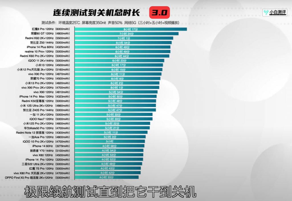 In his most recent video, titled “OnePlus 11 Review“, Chinese technology content creator, Xiaobai’s Tech Reviews collected all battery life data amongst all notable smartphones released in the past 5 months. In his findings, it was discovered that the OnePlus 11 had only managed to achieve a screen-on-time (SOT) of 5 hours and 33 minutes, the worst amongst all Snapdragon 8 Gen 2 flagship devices released so far.