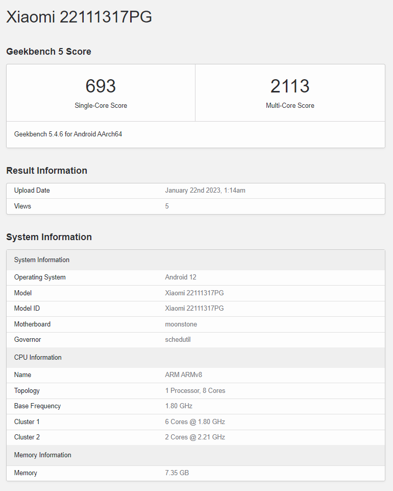 Geekbench has the POCO X5 listed with the model number 22111317PG. A Qualcomm Snapdragon 695 SoC will power the phone’s international model. 2.21GHz is its maximum clock speed. An Adreno 619 GPU is combined with the SoC to provide graphics. The variant shown on Geekbench has 8GB of RAM. We may anticipate POCO releasing the handset with 6GB of RAM as well.