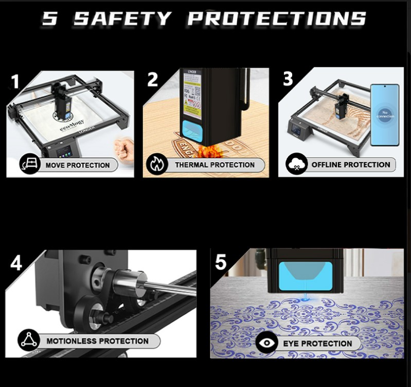Ray 5 20W laser features an interesting XY-Axis limit switch that can accurately locate the position of the module and triggers an alarm when the laser module movies in a negative direction. For your safety and security, the device comes with a thermal sensor that detects accidental flames, automatically stops the laser and starts a buzzing alarm to inform you of the same. In case of a tilt, fire hazard, data connection interruption, or laser head freezing, the emergency stop button s triggered to save your project and device. Moreover for your safety, the device comes with a flame-resistant acrylic laser protective cover and a panoramic filter glass that protects your eyes.
