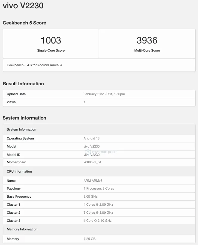 Ahead of the launch, the smartphone has made an appearance on Geekbench showcasing its performance. The device bears the model number V2230 and is powered by the MediaTek Dimensity 8200 SoC. This premium-midrange chipset has eight cores, a peak clock speed of 3.1GHz, and a base clock speed of 2.0GHz.