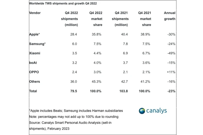 According to a Canalys report, the worldwide TWS shipments in Q4 2022 saw a sizeable decline of 23 percent year on year. During the last three months, the overall TWS market shipped over 79.5 million units over 104 million units in the same quarter back in 2021. This shows that consumer electronics ranging from smartphones to smartwatches and even truly wireless earbuds were impacted by the various supply chain issues and global economy seeing a decline.