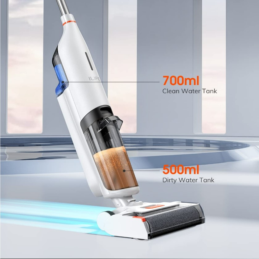 The vacuum cleaner can simultaneously clean and mop the surface and is ideal for cleaning the bathroom, kitchen, balcony, and areas where wet and dry dirt usually occurs. The device comes with a double water tank system that can store 700ml of clean water and 500ml of dirty water. This means you can always clean using fresh water without frequent trips to change it.