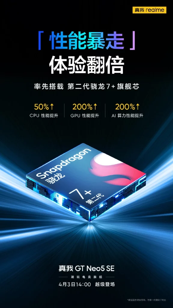 Realme’s Vice President, Global Marketing Director, and China President, Xu Qi, shared an actual image of the second-generation Snapdragon 7+ chip. The Realme GT Neo5 SE is the first device to feature the second-generation Snapdragon 7+ flagship chip (Snapdragon 7+ Gen 2 specifications: 1x 2.91GHz Cortex-X2, 3x 2.49GHz Cortex-A710, 4x 1.8GHz Cortex-A510, and Adreno 725 GPU at 580MHz, with Snapdragon X62 5G modem).