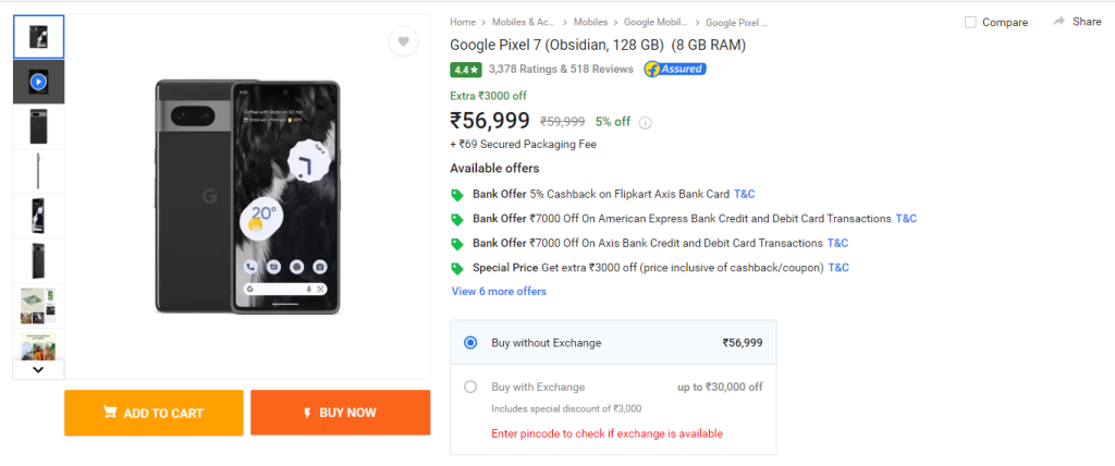 The Google Pixel 7 was initially launched in India at a price of Rs 59,999 for the 8GB + 128GB variant. However, Flipkart is currently offering the phone for Rs 56,999, and there’s an instant discount of Rs 7,000 when purchasing through select bank credit and debit cards such as American Express, SBI, HDFC, ICICI, and Axis Bank. This brings the effective price down to Rs 49,999. Additionally, there’s a trade-in offer of up to Rs 30,000 available for select models. The Google Pixel 7 is available in three color options: Snow, Obsidian, and Lemongrass.