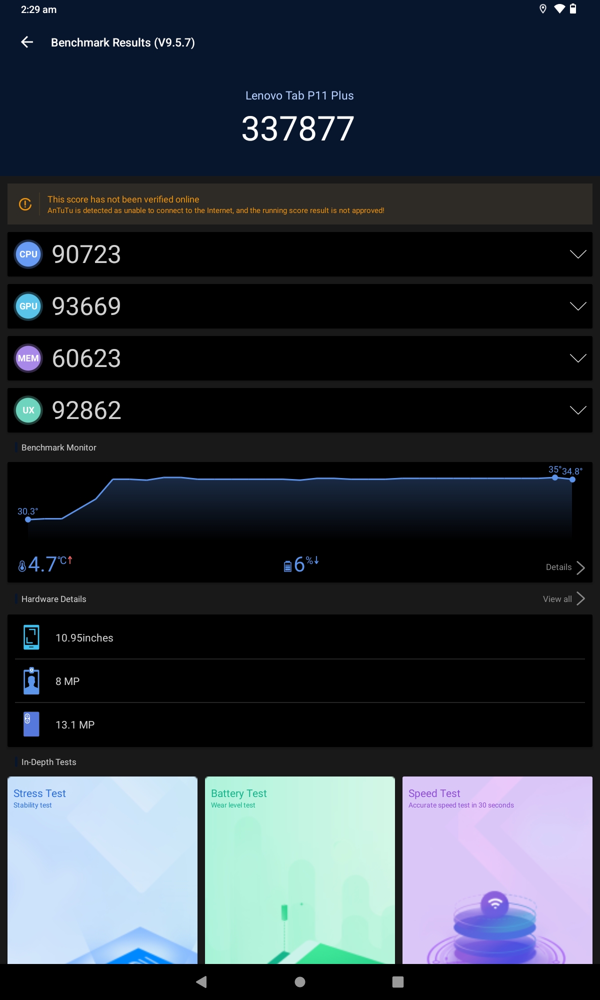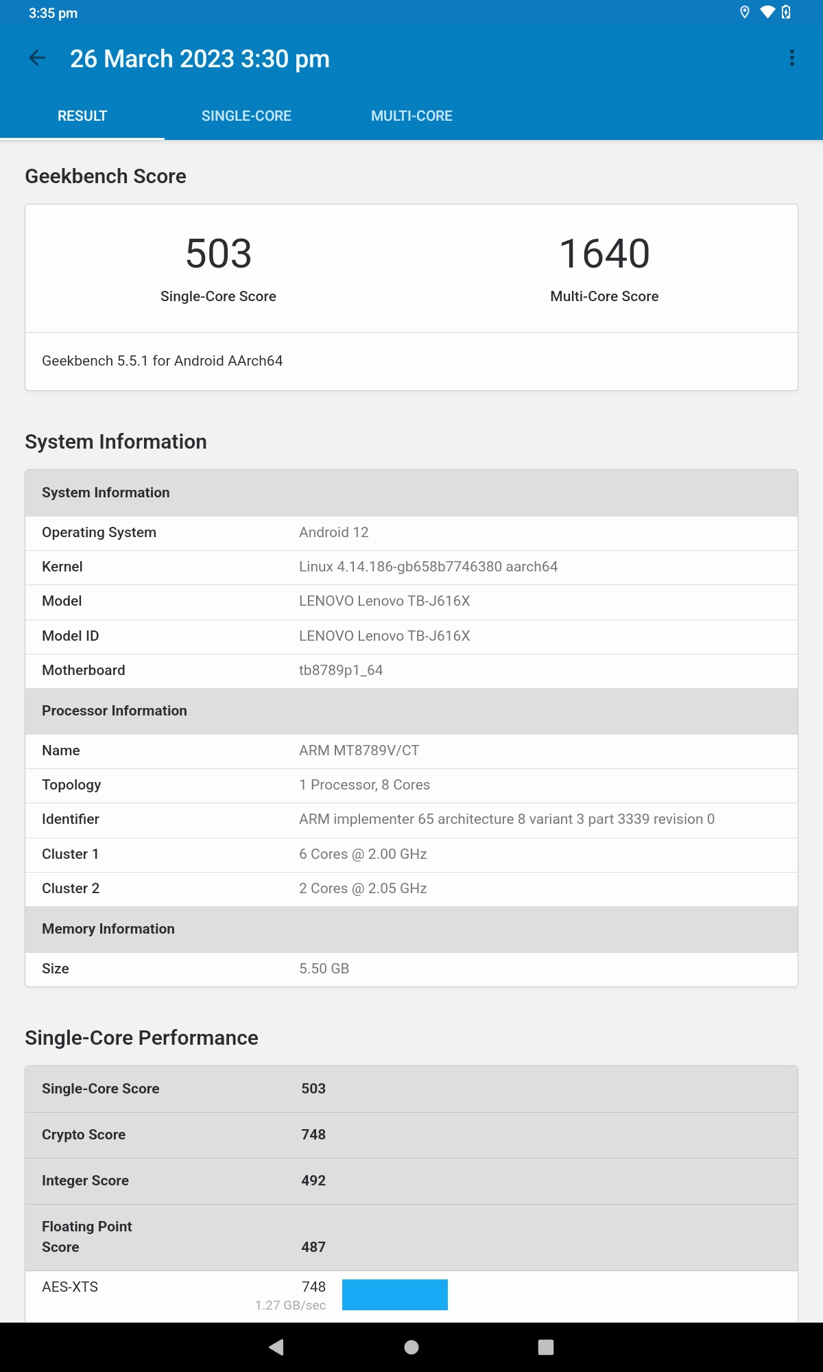 The tablet’s performance is not affected when using multiple applications at the same time or switching between them. For basic computing tasks, the overall user experience is smooth and satisfactory. The Helio G90T chipset performs similarly to the Snapdragon 750G, which is found in devices like the Galaxy Tab S7 FE. In Geekbench 5, the P11 Tab Plus achieved a score of 503 points in the single-core test and 1640 points in the multi-core test. It also achieved a score of 337,877 points on the AnTuTu benchmark test.