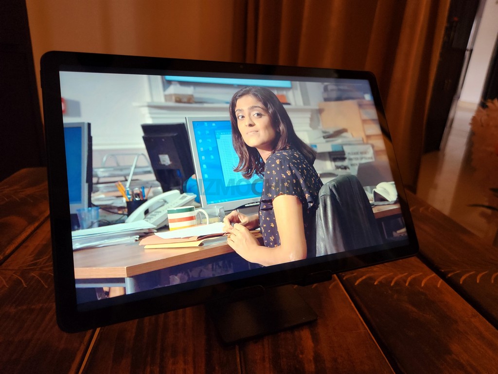 Flipping over to the tablet’s front, users are greeted with an 11-inch IPS panel with a 2K resolution (2,000 x 1,200) and thin bezels surrounding all four sides, resulting in an impressive screen-to-body ratio of around 82%. In landscape mode, the bezels offer ample grip to prevent unintentional screen touches while holding the Tab P11 Plus. The display offers 60Hz refresh rate, 400 nits peak brightness, a 5:3 aspect ratio, and 212 pp pixel density. It comes with HDR support which means users can watch HD streaming content on OTT platforms like Netflix, Prime Video, Disney+ Hotstar, and Hulu.