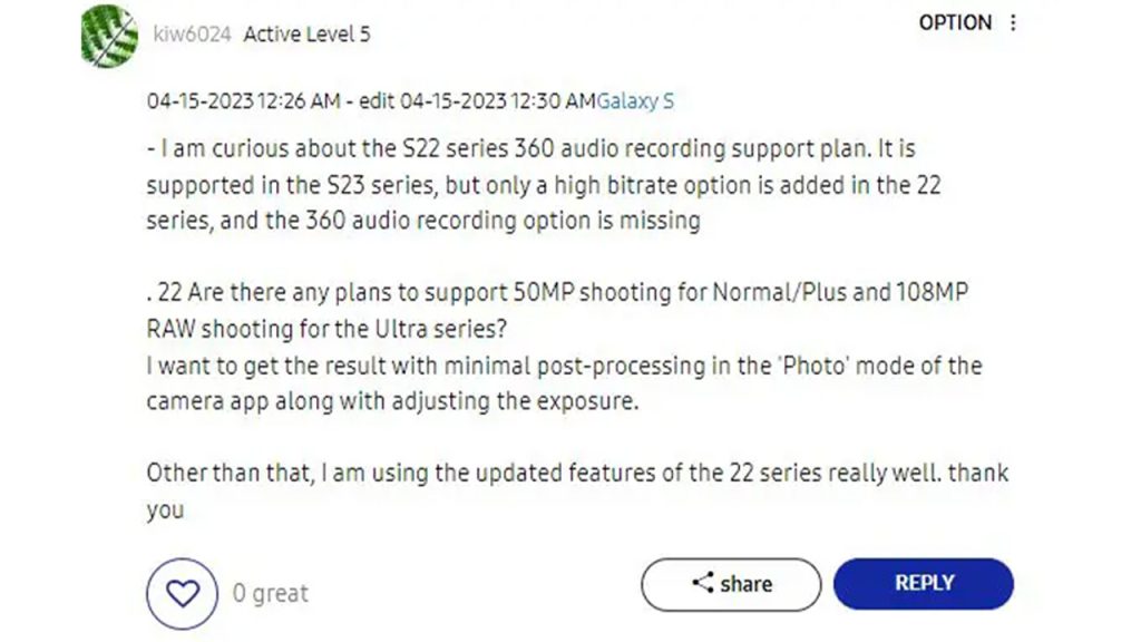 Over the past year, the Galaxy S22 series received support for Expert RAW, watermark features, Astronomical Hyperlapse, and more. The latest Galaxy S23 also comes with advanced features, with new 360 Audio and 200MP RAW camera shooting capability. Many Galaxy S22 users were expecting these innovations to arrive on their phones through future updates.