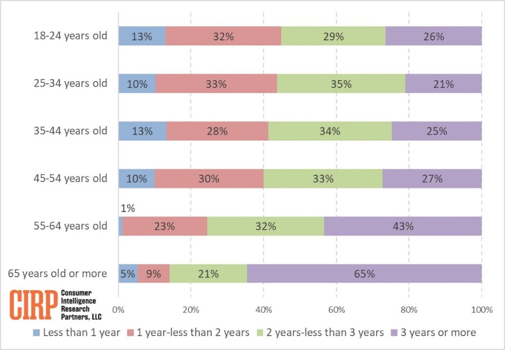According to a recent study by the Consumer Intelligence Research Partners (CIRP) on Apple users, younger people tend to upgrade their iPhones to newer models more frequently than older customers. For example, 45% of users aged 18 to 24 had their previous phone for less than two years, which is over three times the rate of those aged 65 and older. 65% of customers aged 65 or older kept their previous phone for at least three years, a figure more than 2.5 times greater than the percentage observed in the 18 to 24 age group.