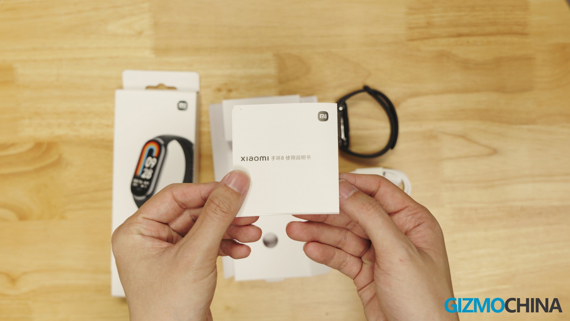 Compared with its predecessor, the packaging of the Xiaomi Smart Mi Band 8 is almost unchanged except for some patterns and texture, and the accessories inside the package are almost the same, we have the Xiaomi Smart Band 8 body, a manual, a strap and a magnetic charging cable.
