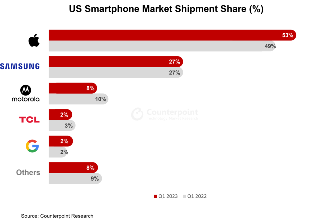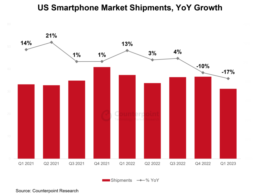 US Smartphone Shipments Decline in Q1 2023 Amid High Inflation, Inventory Correction; Apple Share Up