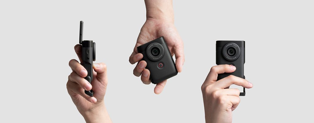 The Canon PowerShot V10 is a compact and lightweight camera that is said to fit in the user’s pocket. It features a retractable and tilted stand that can be attached to the camera body so there’s no need to carry a tripod and shoot steadily from multiple positions. The vertical grip is said to fit both left and right-handed users and make it more stable while holding. The PowerShot V10 also features a small 2-inch screen that can be tilted to adjust the camera angle. There are buttons at the front and rear for recording and making any adjustments.