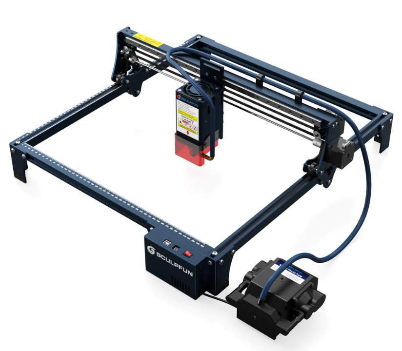 The SCULPFUN S30 Pro Max Laser Cutter boasts an industrial-grade, non-shaking X-axis guide rail for precise engraving and cutting of various materials. It delivers detailed results with minimal ripple patterns, unlike standard engravers. Its high-pressure air-assisted metal nozzle provides efficient cutting with a 30L/min airflow, removing debris for a clean finish on woodcuts.