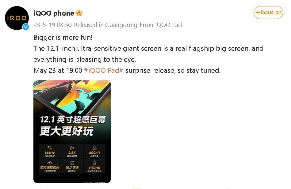 iQOO is set to launch its first tablet in China on May 23rd. The device will be dubbed as an iQOO Pad. Now ahead of the launch next week, the Vivo sub-brand has started teasing the key specifications of the upcoming offering on the microblogging platform Weibo.