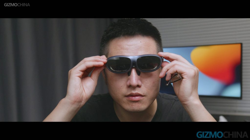 As you can see, I have myopia. Many AR glasses are not friendly enough for myopic people. Either they require me to have new customized lenses or wear contact lenses to use them. But with the Rokid Max, you got the knobs here to adjust the diopter for each eye respectively and simulate the sharpest image you can see. It’s just so impressive! I confess, now I take it with me wherever I go, even when I lay down to rest, though, it might look a bit wield. The nosepiece here is replaceable and adjustable. There’s an extra nosepiece included in the package. I have to say it’s really comfortable to wear and didn’t cause dizziness even after long-time use.