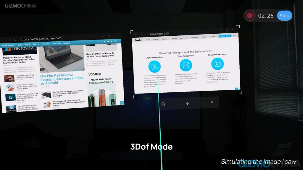 When activating 3Dof in AR mode, you will have 3 degrees of freedom tracking, which means you can adjust the content in three axes of freedom, front to back, left to right and top to bottom. Then just turn your head to break the edges of the display.