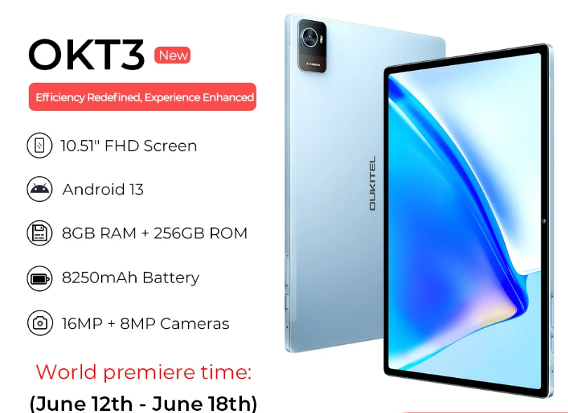The global launch of the OUKITEL OKT3 Tablet is scheduled for June 12, 2023, and it will be exclusively available on AliExpress. This exciting event will offer customers a fantastic opportunity to take advantage of significant discounts on this remarkable tablet. For a limited time during the world premiere sale, the OUKITEL OKT3 Tablet can be purchased for an incredibly low price of $149.99. Please note that this sale starts on June 12 and ends on June 18, 2023.