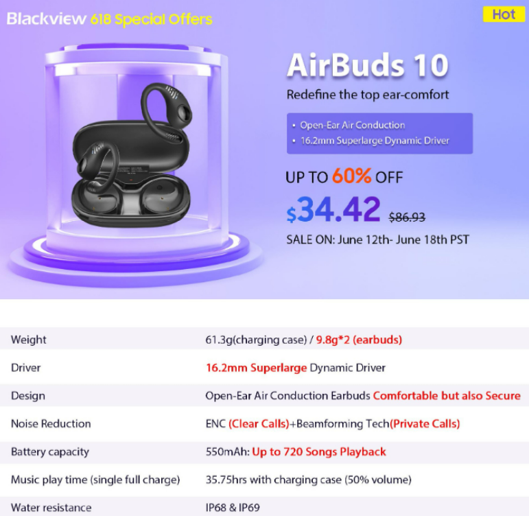 Blackview AirBuds 10, is a true contender even among high-end earbuds. These earbuds are crafted from skin-friendly TPU material and weigh just 9.8g per earbud, providing a comfortable and secure fit with their ergonomic ear hook design. With an innovative open-ear design and advanced air conduction technology, these earbuds allow you to stay aware of your surroundings without the need for inserting anything into the ear canal, prioritizing safety. Equipped with cutting-edge φ16.2mm superlarge dynamic drivers, the AirBuds 10 deliver breathtaking 3D surround sound, immersing you in an exceptional audio experience. Discover the perfect balance of comfort and audio excellence with the Blackview AirBuds 10.