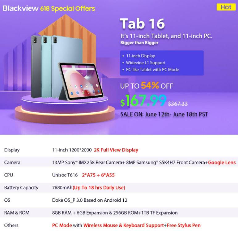 Take advantage of a remarkable 54% discount on the Blackview Tab 16, available now for just $167.99 instead of the original price of $367.33