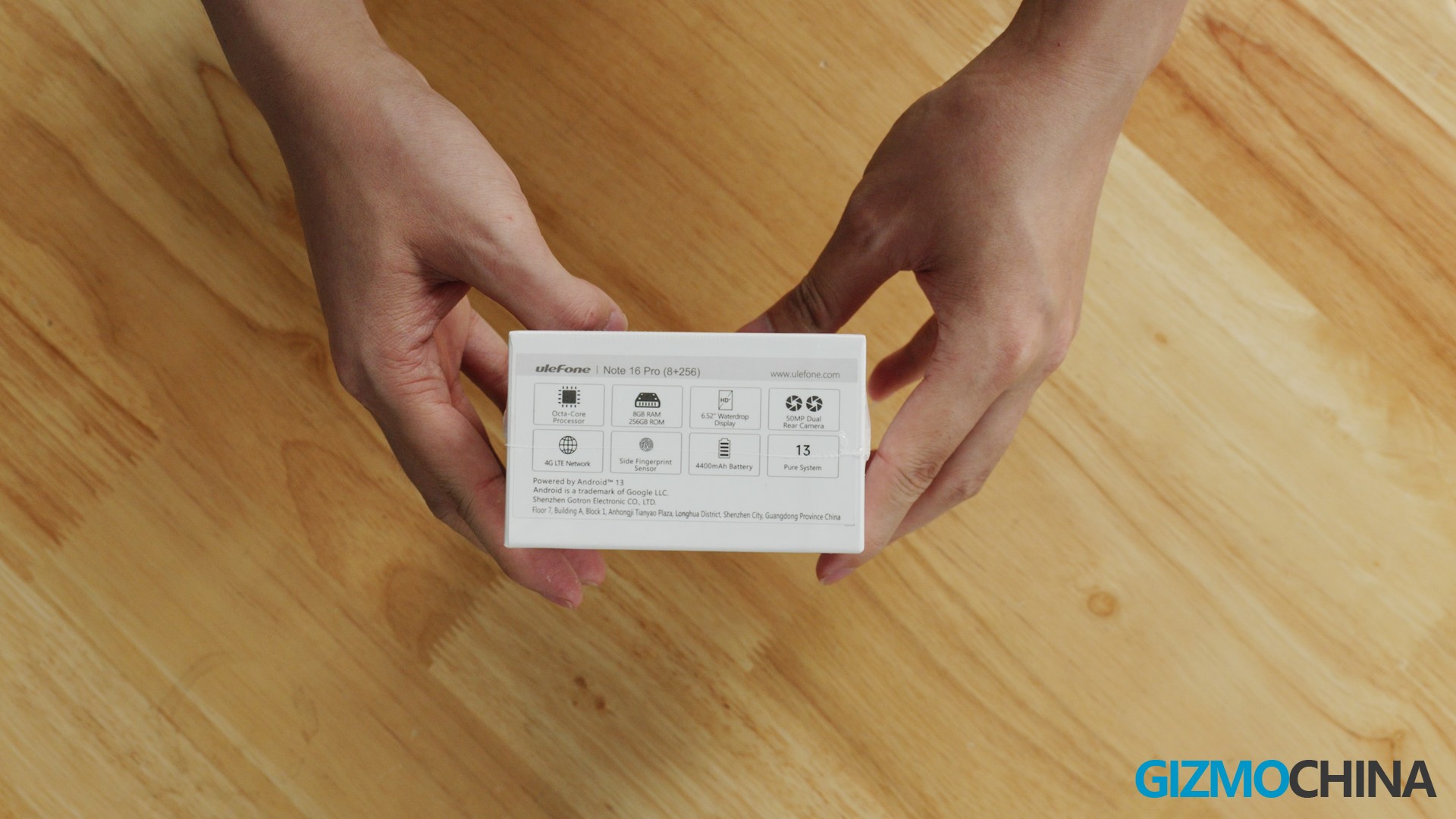 The UleFone Note 16 Pro comes in a very simple package, on the top we see some basic information about the phone: it has 8GB of RAM and 256GB of ROM, coming with Android 13 pre-installed, which is really surprising to me considering that this is a super budget model and they don’t usually run on the latest version of Android.