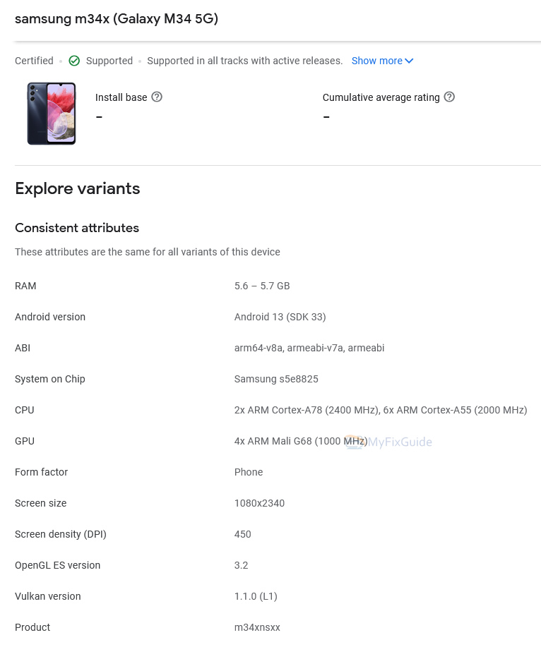 Samsung Galaxy M34 5G Google Play Console listing